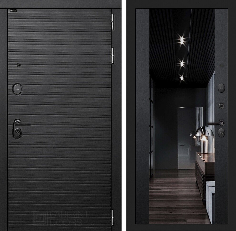 Фурнитура в черном цвете: Броненакладка врезная, накладка со шторкой, глазок , дверная ручка, ночная задвижка. Цилиндр ключ-вертушка Apecs, регулируемый эксцентрик.